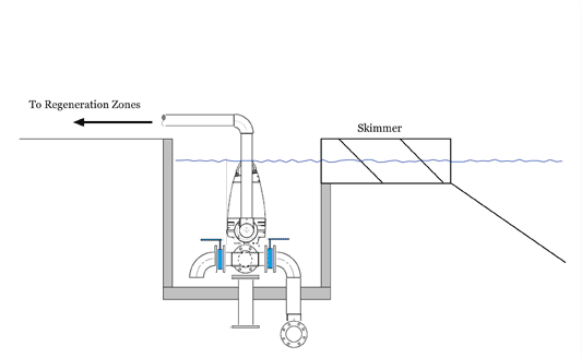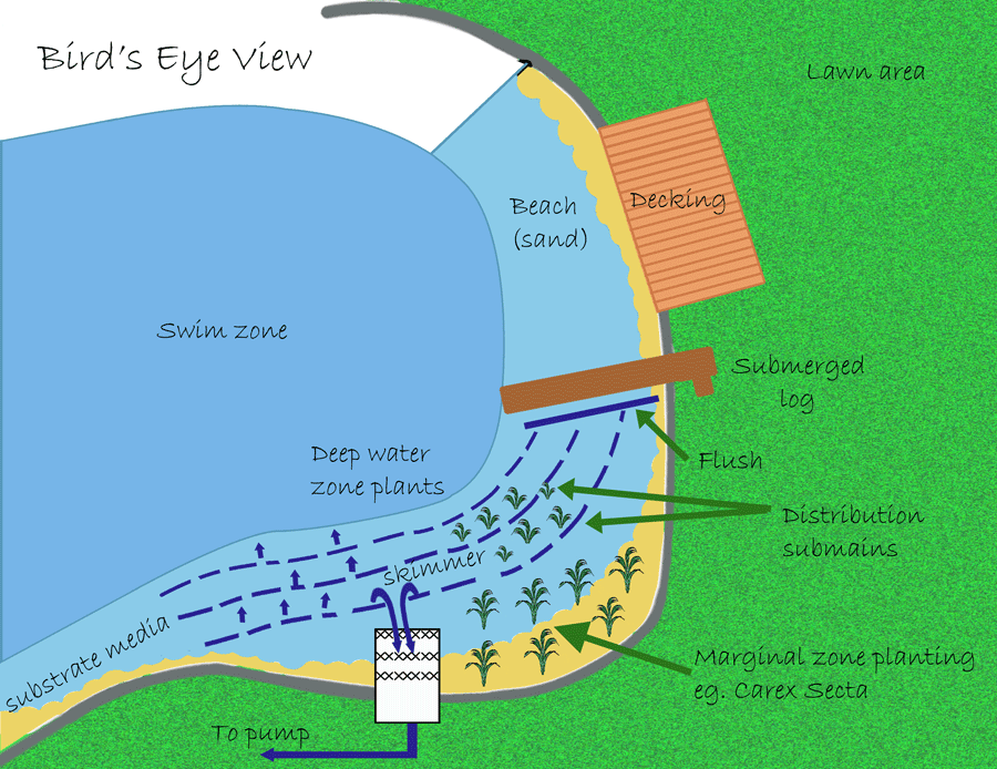We have designed a pump chamber which incorporates filtration. Water is drawn from the pool, filtered, then pumped out through a natural plant and substrate filtering system. Virtually no maintenance is required.